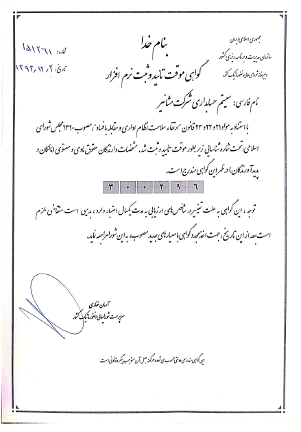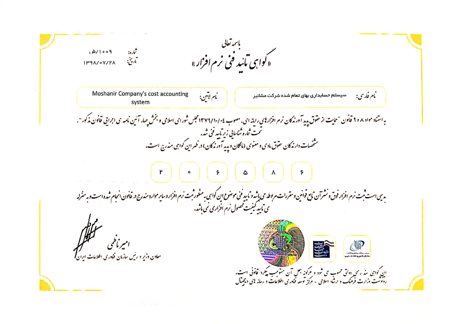 گواهی تائید فنی نرم افزار حسابداری بهای تمام شده مشانیر