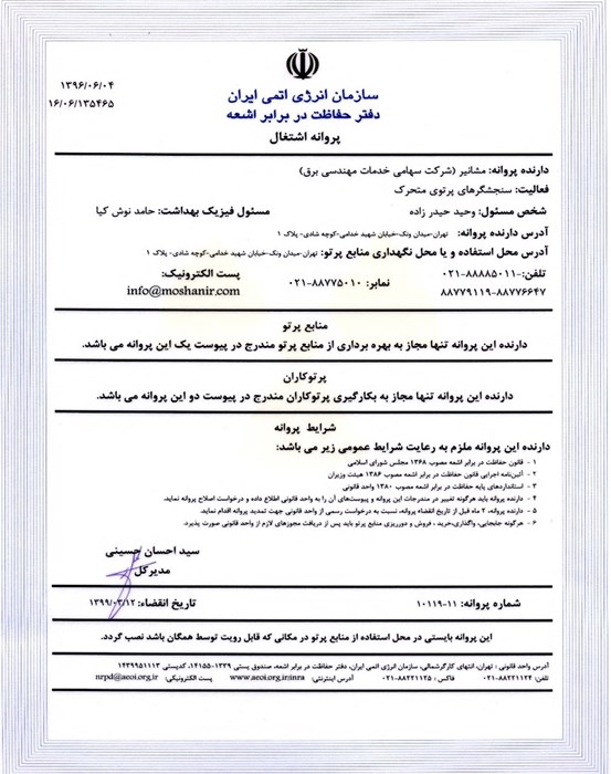 پروانه اشتغال استفاده از سنجشگرهای پرتوی متحرک از سازمان انرژی اتمی ایران